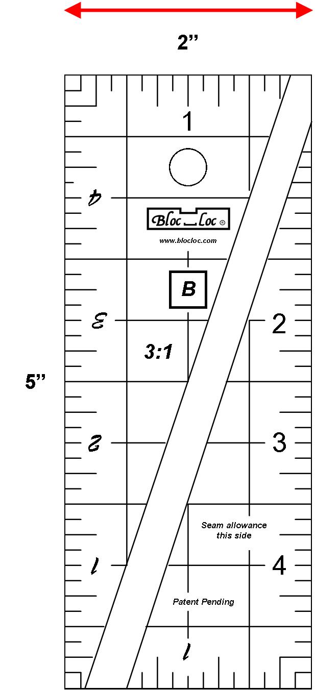 Bloc Loc’s Half-Rectangle Triangle 3:1 Mini Set contains two multiple-sized rulers 2″ x 5″. Each ruler is a mirror image of the other and the groove locks onto the seam for control and perfect trimming every time. Rulers can trim in 1/8″ increments which allows a wider range of blocks available to quilters.