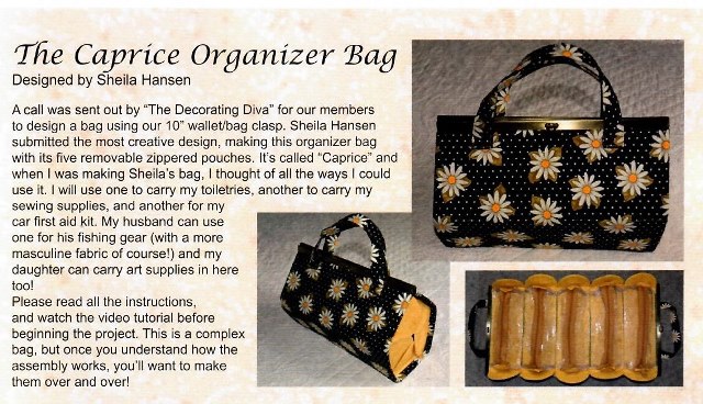 The Caprice Organizer Bag, designed by Sheila Hansen, combines great design with function. The five removable pouches can be used to hold toiletries, travel supplies, sewing notions, first aid supplies and well… you get the picture. Along with this pattern, you will get the 10″ frame in black or bronze.