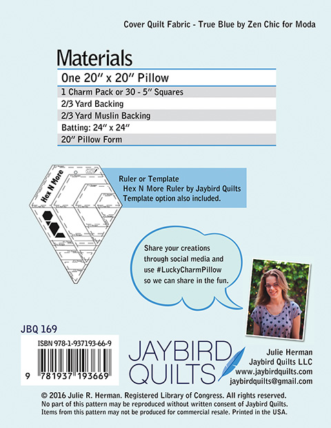 A great project to make using the Hex N More Ruler from Jaybird Quilts. Lucky Charm Cushion measures 20" x 20".