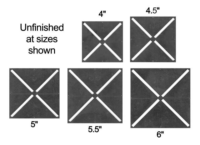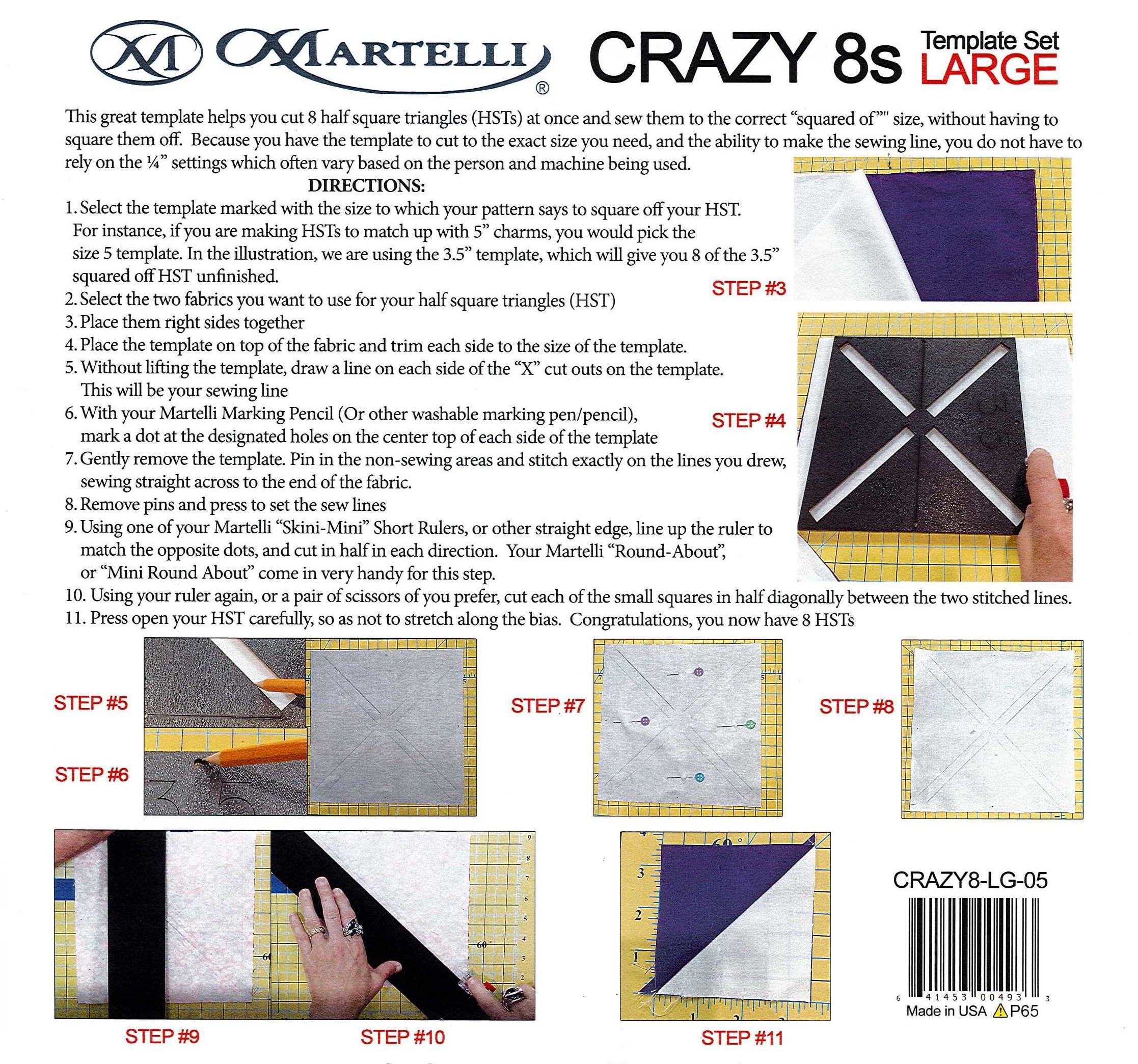 Martelli Crazy 8s Large consists of 5 templates with Martelli's famous non-slip material on the back (the whole secret of accuracy) in Unfinished Half Square Triangles Sizes of 4", 4.5", 5", 5.5" & 6".