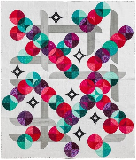 The girls had so much fun designing Moon Dance!  The pattern creates the illusion of overlapping areas which appear to change colour.  Any three colours can be used to create this illusion.  This quilt used Hoffman Fabrics Me + You line of batiks for the cover quilt.