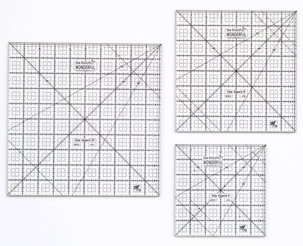 Unique marks for squaring-up 4" x 4" units from multiple Sew Kind of Wonderful patterns.