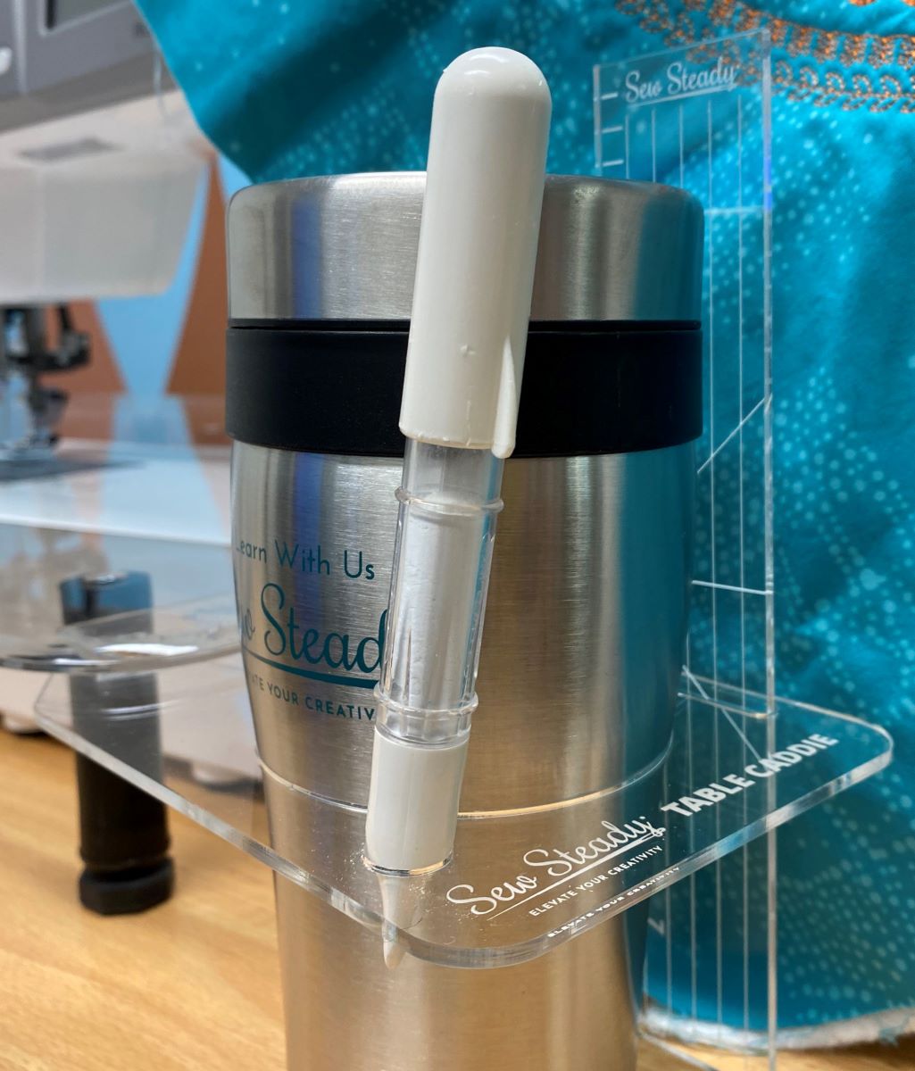 The Sew Steady Table Caddie and Ruler is the perfect companion for your table to easily store your beverage container and a pen on your Table using this new acrylic Table Caddie!
