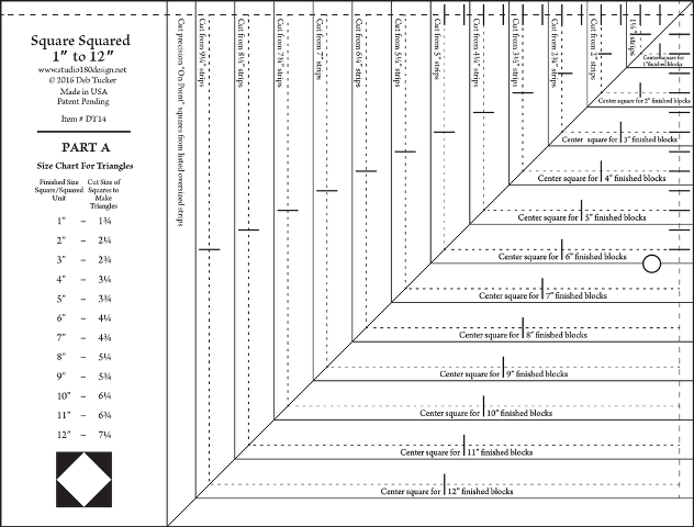 This big, versatile, two piece tool set comes with the basic instructions for making Diamond Square units that finish from 1” up to 12” in whole inch increments. Many have asked for a larger Square Squared tool to frame modern quilts of for framing beautiful embroidery. BUT, you may also use this tool to make Stacked Squares (like in Storm at Sea), Pineapple Blocks, Snail's Trail Blocks and a fancy version of Flying Geese.