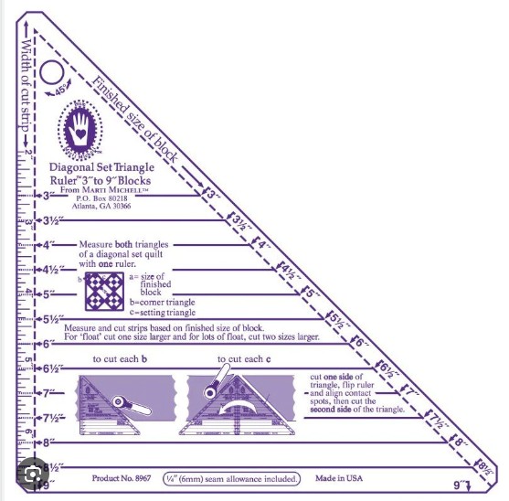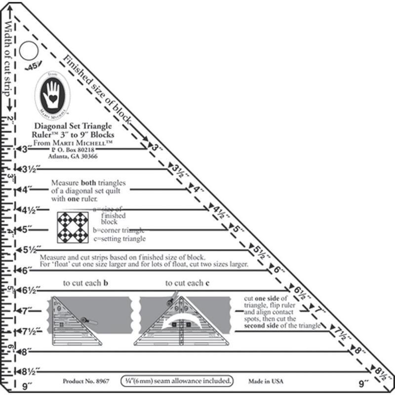 The Small Diagonal Set Triangle Ruler by Marti Michell is for 3-inch to 9-inch finished blocks