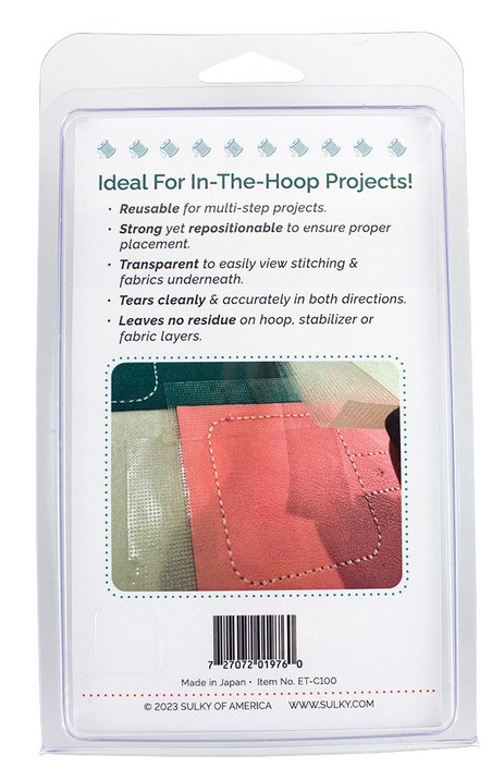 Sulky Clear Embroidery Tape easily secures fabrics & notions in the hoop to prevent shifting during stitchouts.