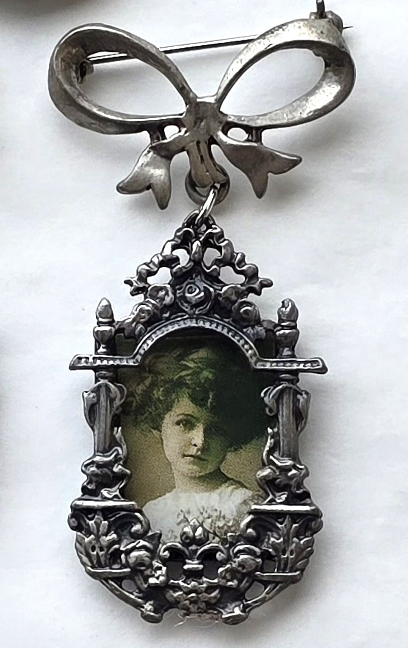 Pewter Frame Brooch - Rectangle Shape with Ribbon Bow - suitable for a photograph or fine embroidery.