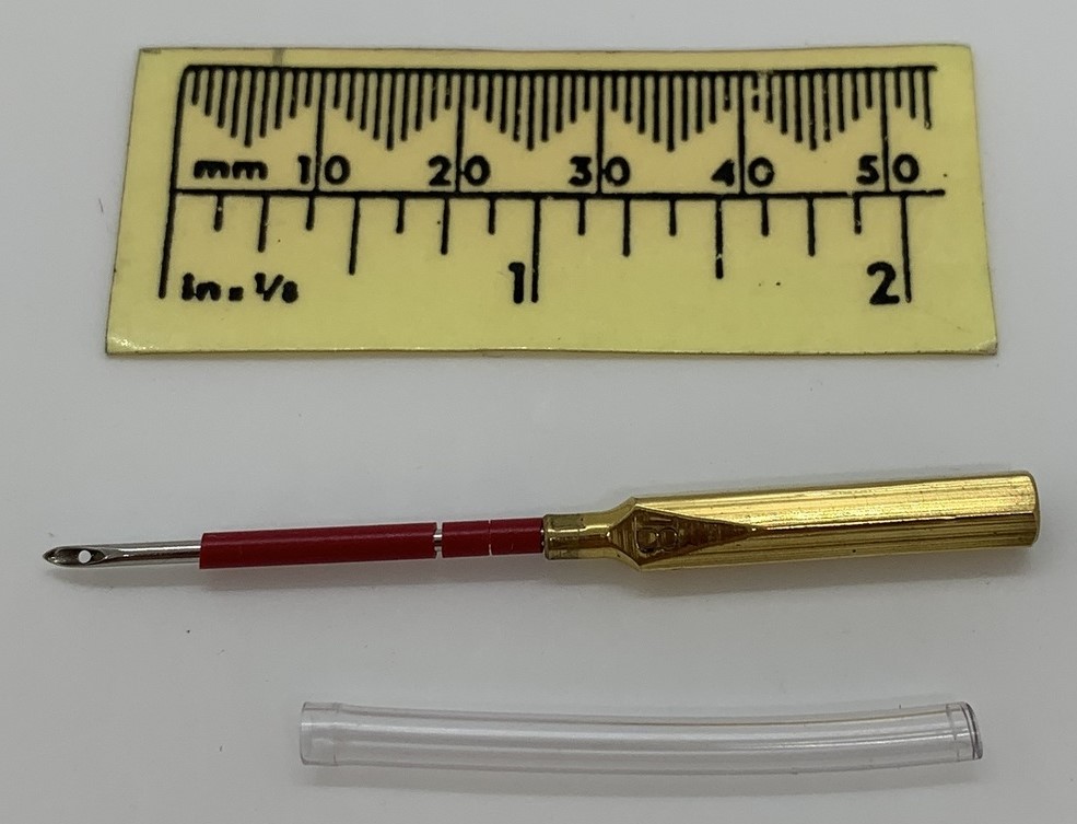- The gauge (red coloured plastic tubing for #3) is an incredibly simple method of creating and maintaining consistent loop size with every stitch while the threader makes threading the needle a breeze.