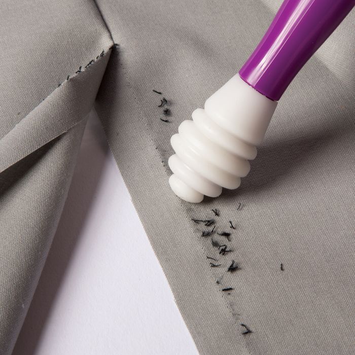 - Specially formulated plastic material grabs and removes excess threads without marking or sticking to the fabric.