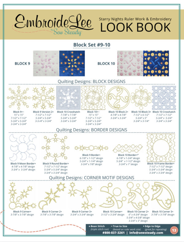 Each Block Set contains 2 Blocks of the Starry Nights Quilt.  With that you receive the unique Templates to make that block along with the two block patterns from the full book along with the 2 hour video based class.  You also receive the two full embroidery collections for 1 for each block of the in the set and the  Bonus video based education for each set.  That is right each block set is full of bonuses!