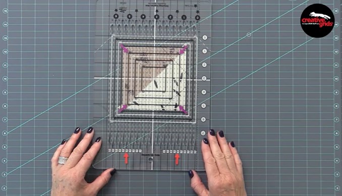 • Turn the ruler around and use the black and white squares to square up blocks in 1/4" increments up to 6 1/4"