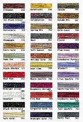 cinnamon 210, jet black silver 299, periwinkle 325, champagne 331, fools gold 334, aqua ice 341, peach sherbet 373, real red 377, midnight silver 388, snowfall 390, black hills gold 399, soft gold 701, goldilocks 356, celebration 361, spring mix 362, maui 363, soft sunset 364, holiday gold 365, sour lime 704, mauve sparkle 706, raspberry delight 707, fire red 709, turquoise gold 711, midnight gold 712, tuxedo 366, autumn mix 367, gold coast 368, fiesta 369, plum crazy 370, strawberry parfait 372, bluebell 755, lilac sparkle 756, sparkling grey 757, cranberry sparkle 760, teal sparkle 761, dusty teal 763