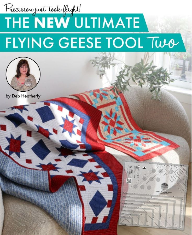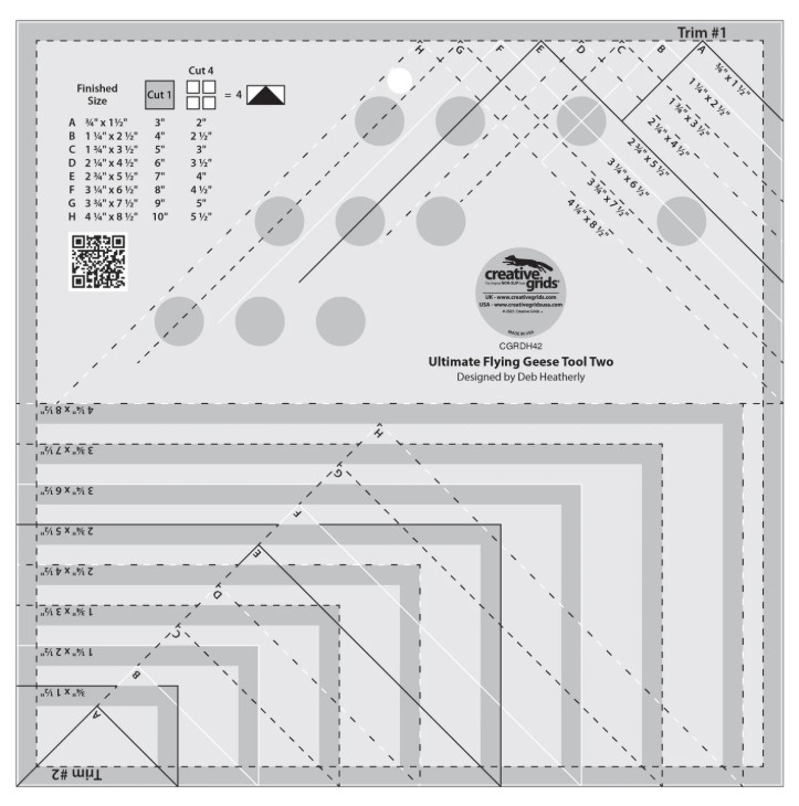 The Ultimate Flying Geese Tool Two designed by Deb Heatherly for Creative Grids® makes eight additional sizes of Flying Geese units, four at a time with squares. No Triangles required.